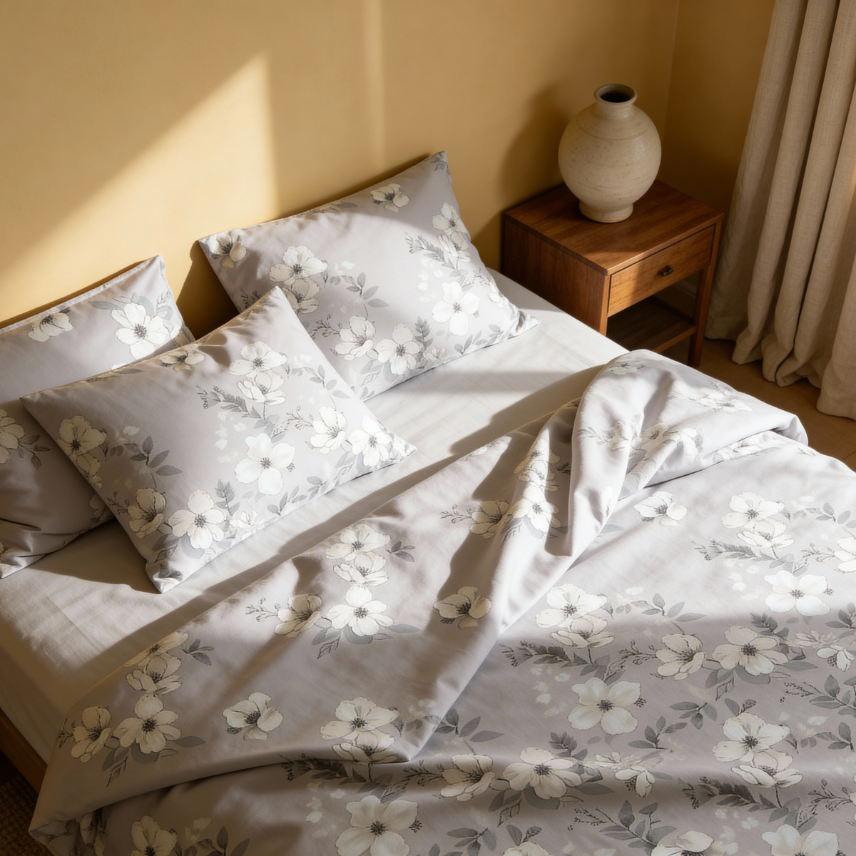 100% хлопковый сатин высокого качества придает ткани неповторимую мягкость, роскошное легкое сияние и долговечность. Идеально подходит для тех, кто ценит качество и эстетику в своей спальне.